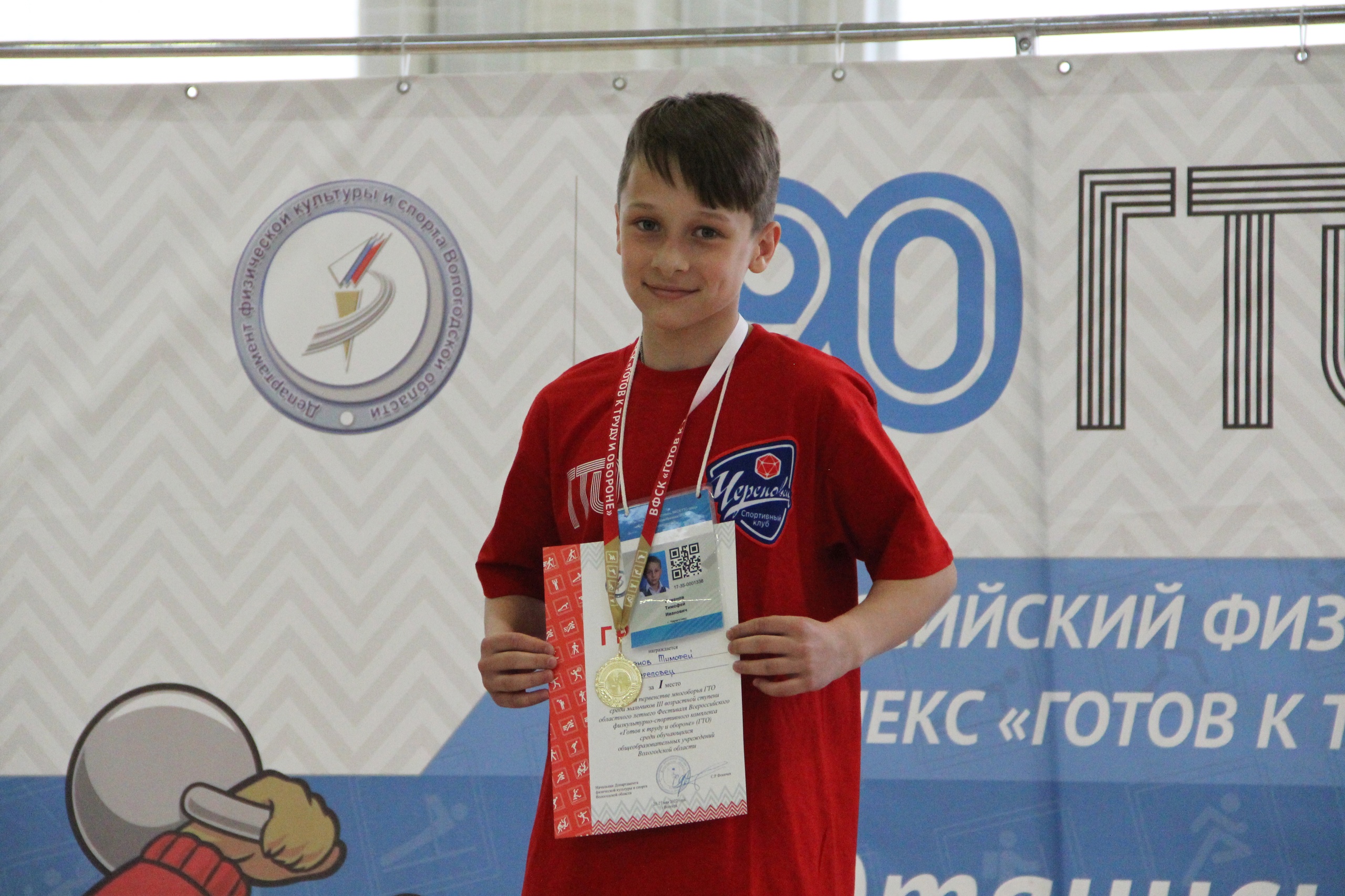Еще одна награда - золотая медаль в личном первенстве. Тимофей Баженов показал лучший результат среди мальчиков в своей возрастной категории (III ступень). Как и другие победители в личном первенстве, он получил право представлять Вологодскую область на финальном этапе фестиваля ГТО, который пройдет в сентябре этого года в Международном детском центре "Артек". Сегодняшняя медаль не первая в копилке Тимофея. Юный спортсмен занимается легкой атлетикой и уже занимал призовые места в соревнованиях.