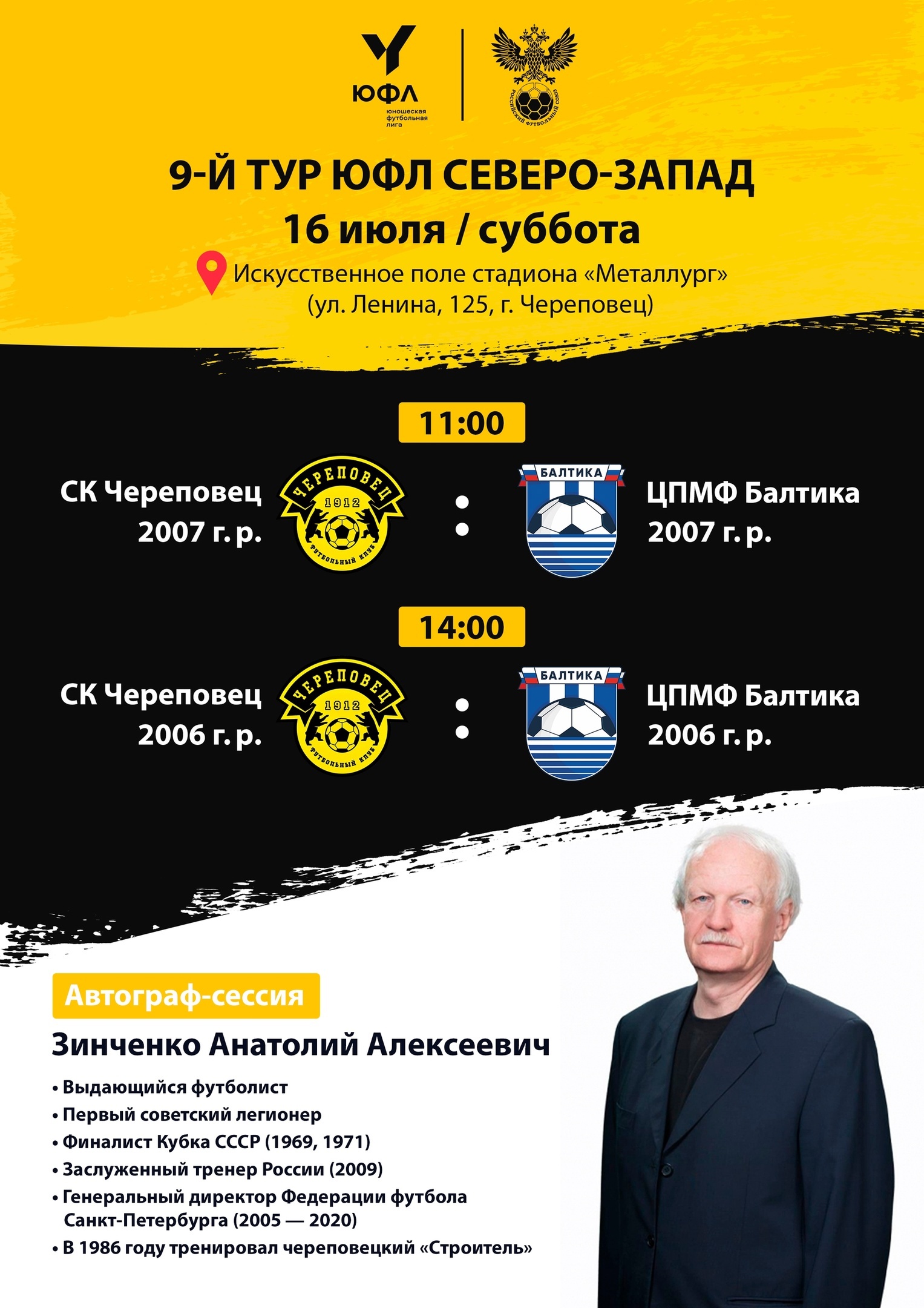 Легендарный футболист Анатолий Зинченко посетит футбольный матч, который пройдет в Череповце в рамках 9 тура Юношеской футбольной лиги Северо-Запад.