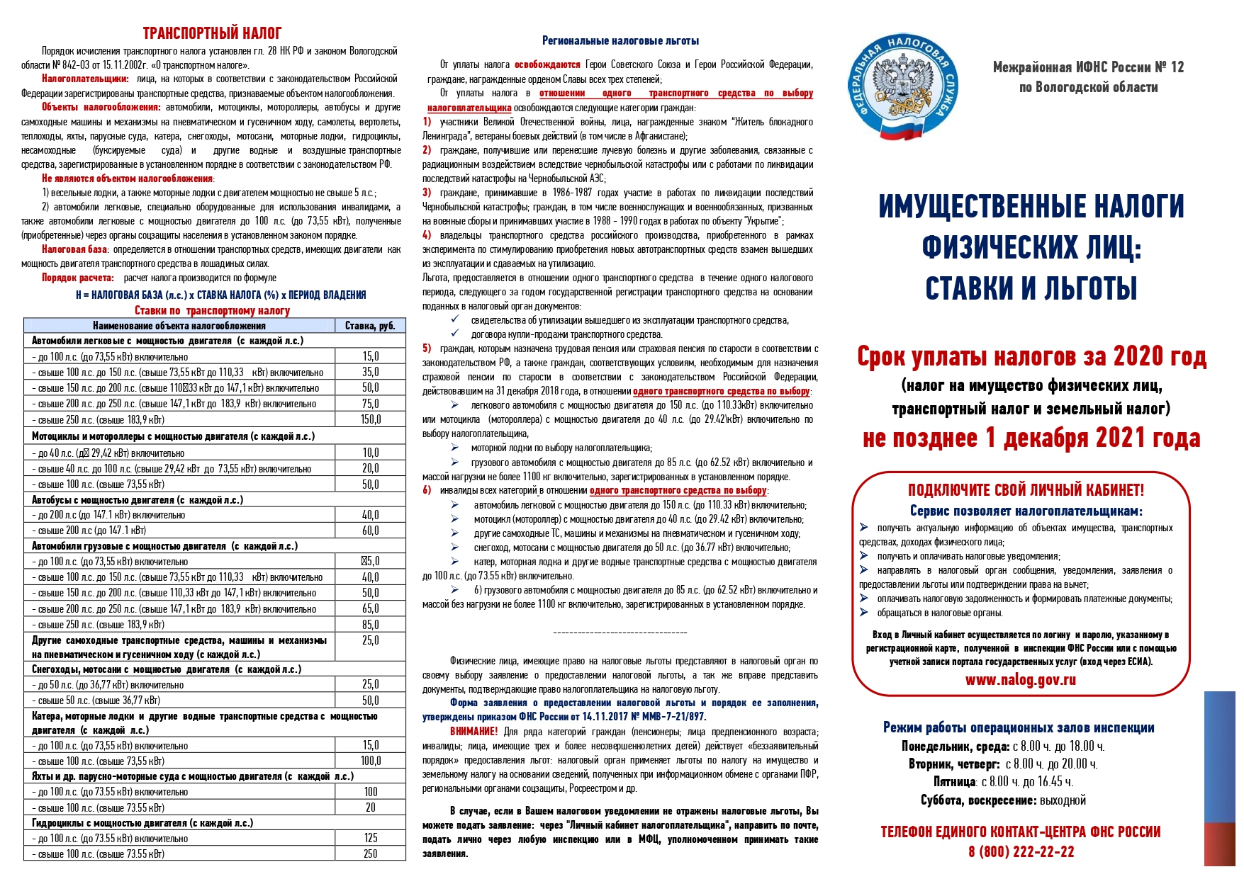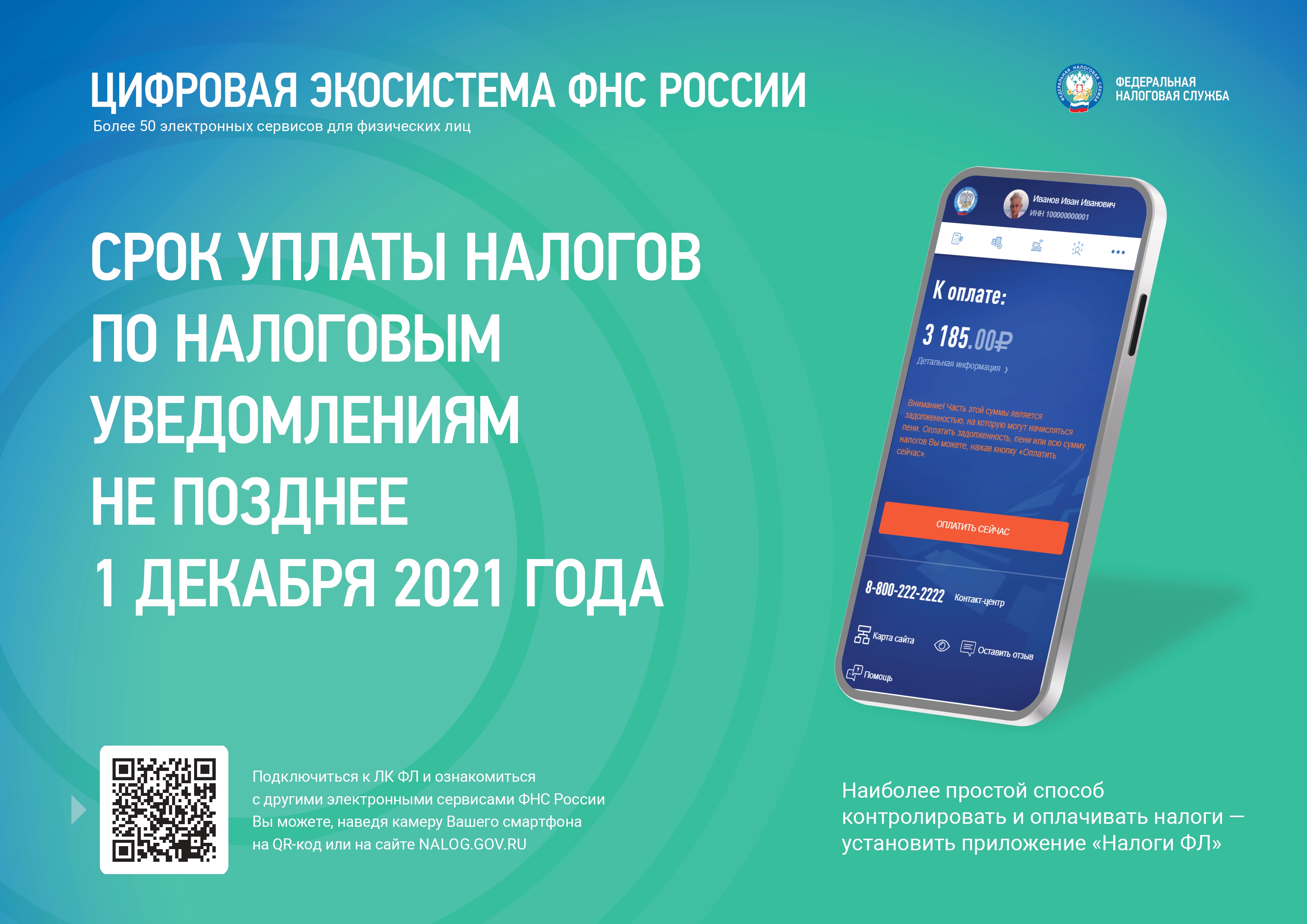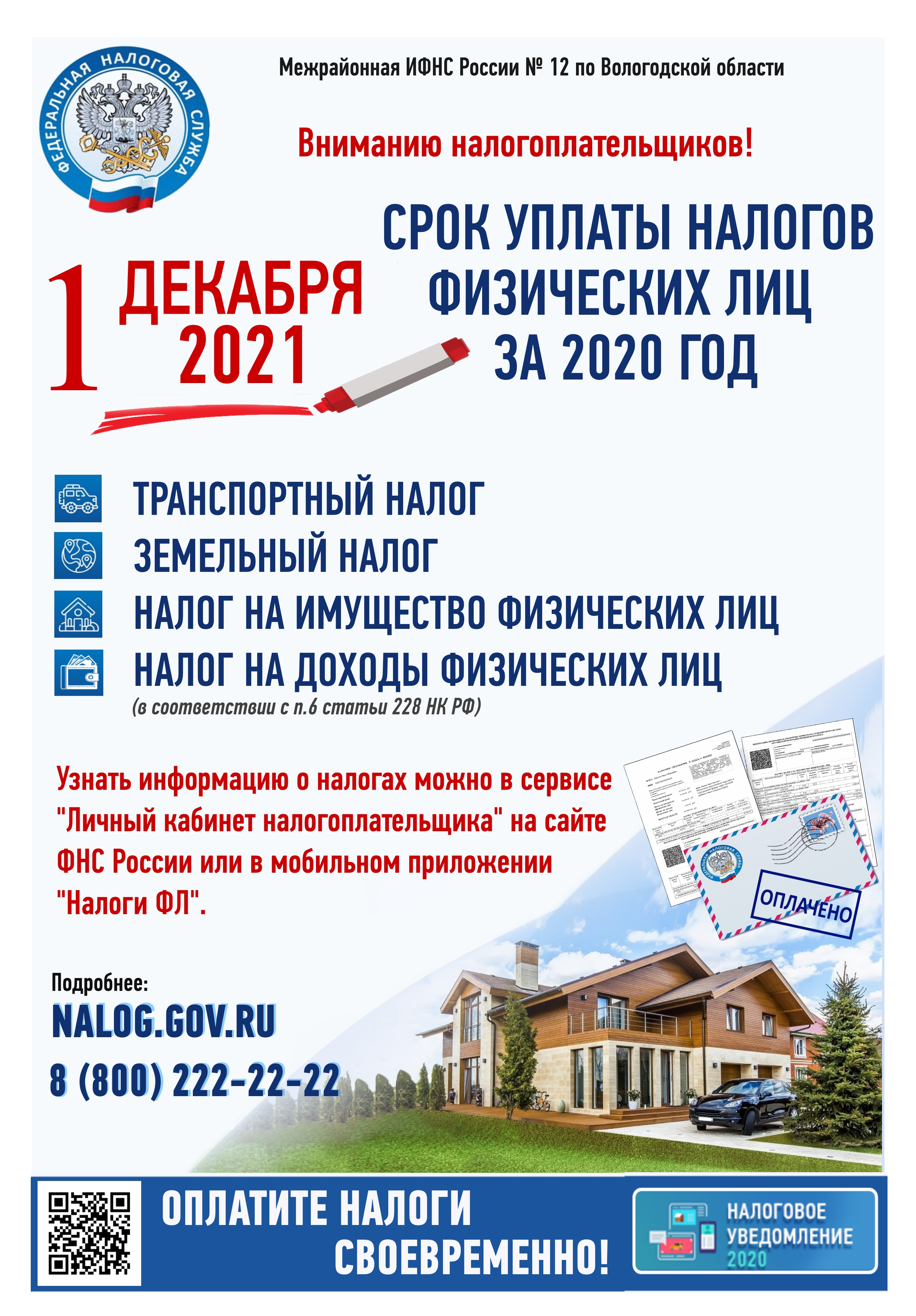 ФНС России напоминает, что срок уплаты имущественных налогов (транспортного, земельного налога и налога на имущество), налога на доходы физических лиц за 2020 год – не позднее 1 декабря 2021 года.
