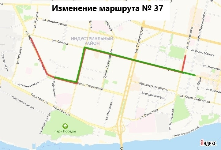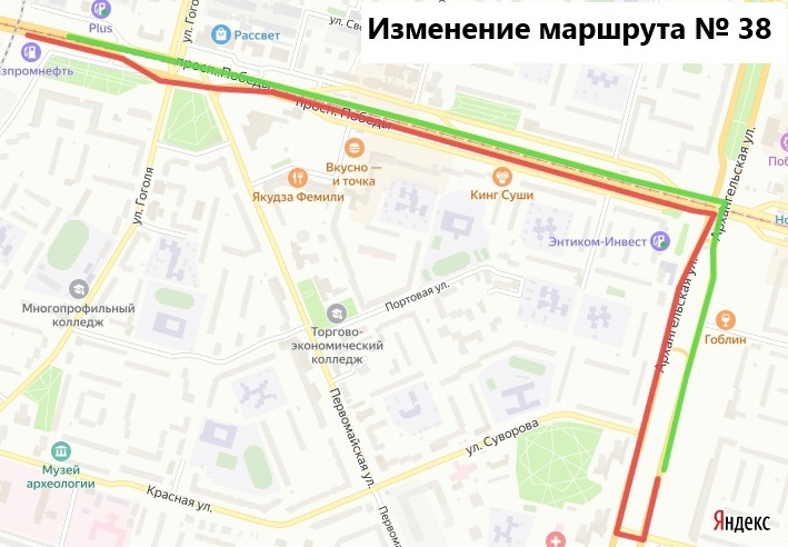 маршрут № 38. При движении из Индустриального района автобус поедет прямо по проспекту Победы до улицы Архангельской, где будет разворачиваться и выходить на обычный маршрут.