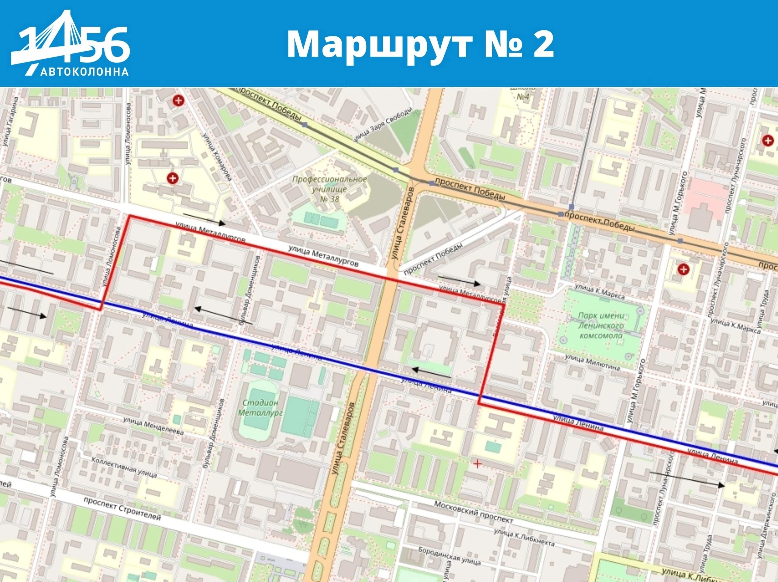 маршрут №2 будет осуществлять движение в прямом направлении без изменения. В обратном направлении ул. Ленина - ул. Ломоносова- ул. Металлургов - ул. Вологодская - ул. Ленина далее по маршруту;