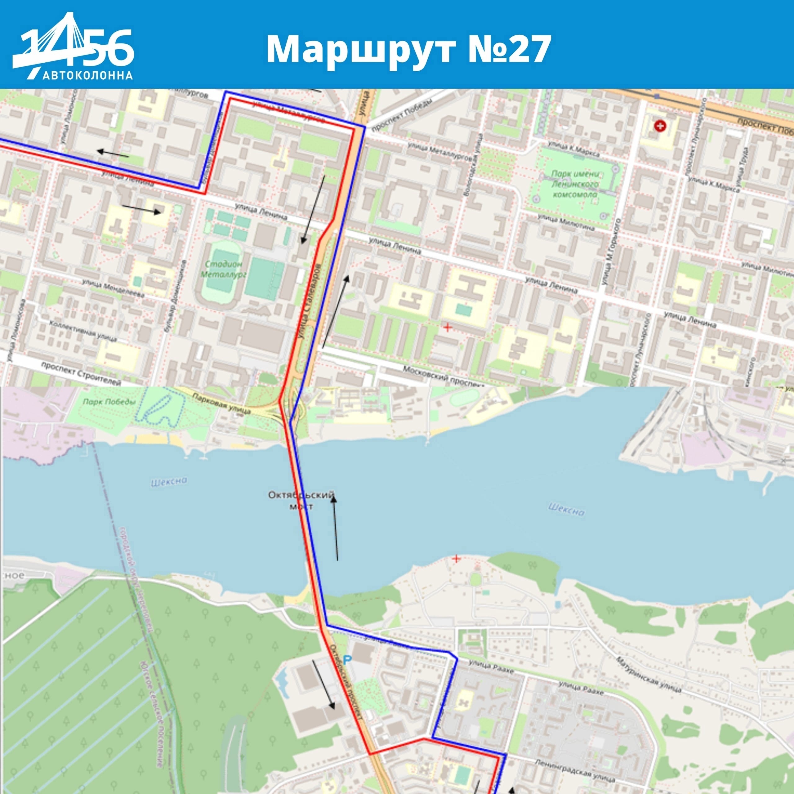 маршрут № 27. Автобус проследует по маршруту: Рыбинская - Шекснинский – Годовикова – Ленинградская - Батюшкова – Раахе - Октябрьский мост - Сталеваров - Металлургов - Доменщиков - Ленина и далее по маршруту. Обратно по Индустриальному району – с теми же изменениями, по Зашекснинскому району– без изменений.