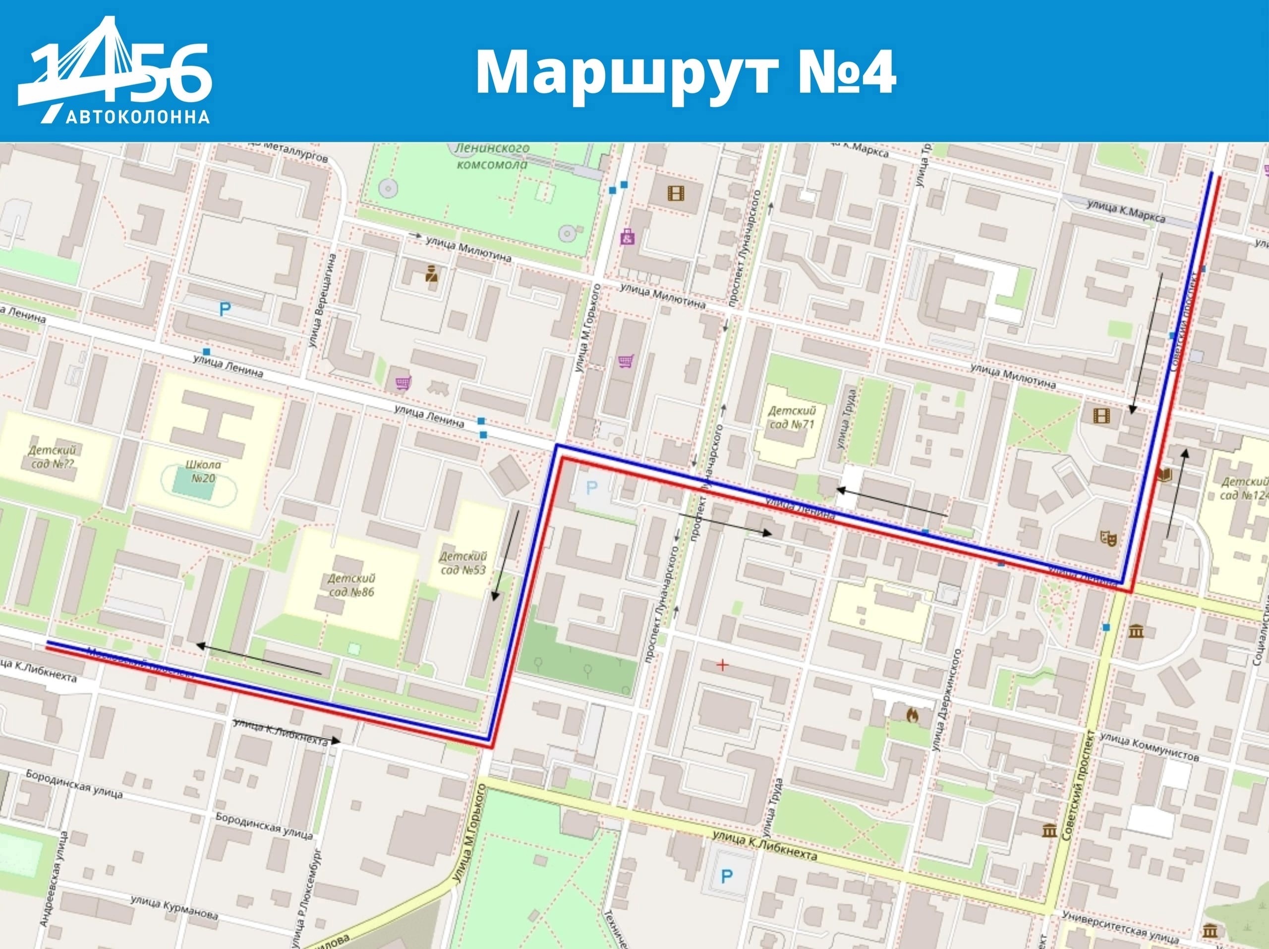 маршрут № 4 будет осуществлять движение пр. Советский - ул. Ленина - ул. М.Горького далее по маршруту в прямом и обратном направлении.