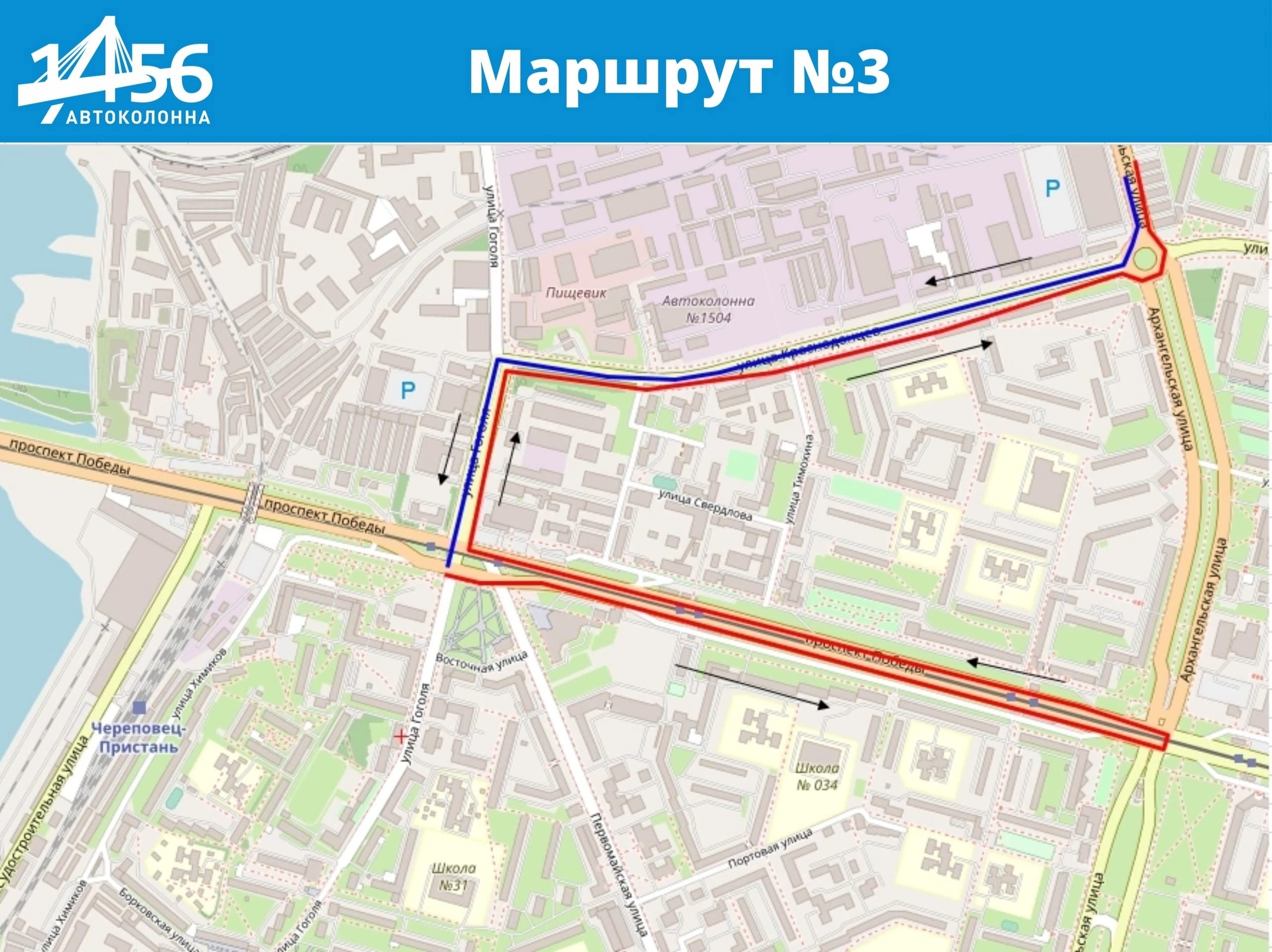 маршрут № 3 будет осуществлять движение по ул. Гоголя - пр. Победы, разворот на перекрестке пр. Победы и ул. Архангельской, пр. Победы - ул. Гоголя далее по маршруту.