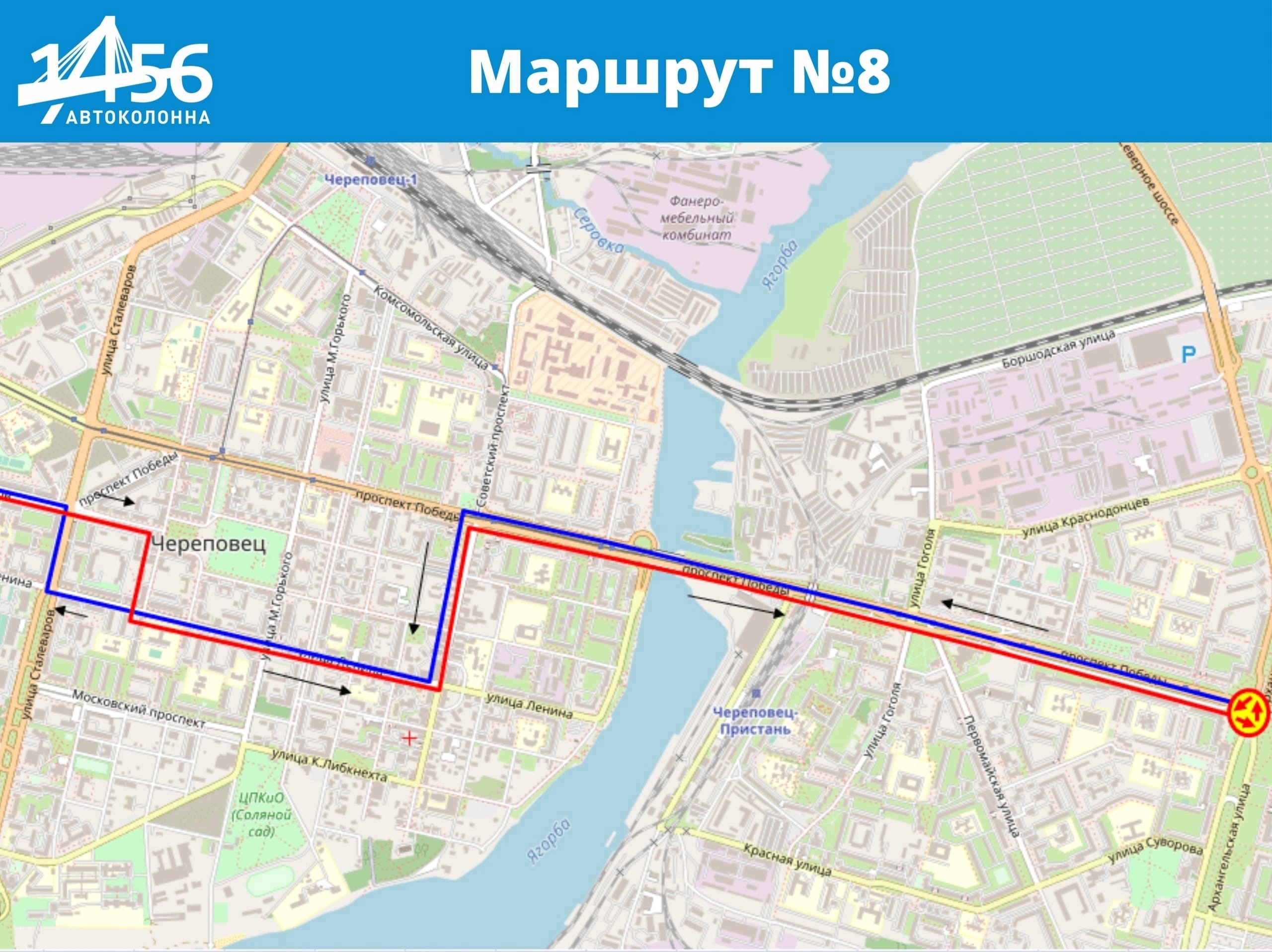 маршрут № 8 будет осуществлять движение по пр. Победы с остановки ул.Суворова по пр. Победы - пр. Советский - ул. Ленина далее по маршруту. В обратном направлении ул. Ленина - ул. Вологодская ул. Металлургов - ул. Вологодская - ул. Ленина - Советский пр. - пр. Победы до остановки Суворова.