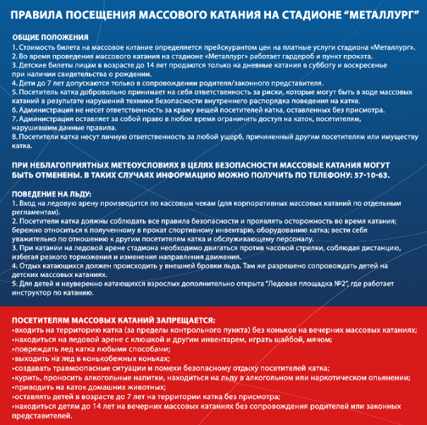 Билеты на ледовую площадку для начинающих приобретаются только в уличных кассах на стадионе "Металлург" (ул. Ленина, 125). Уличные кассы открываются за час до начала сеанса катания.