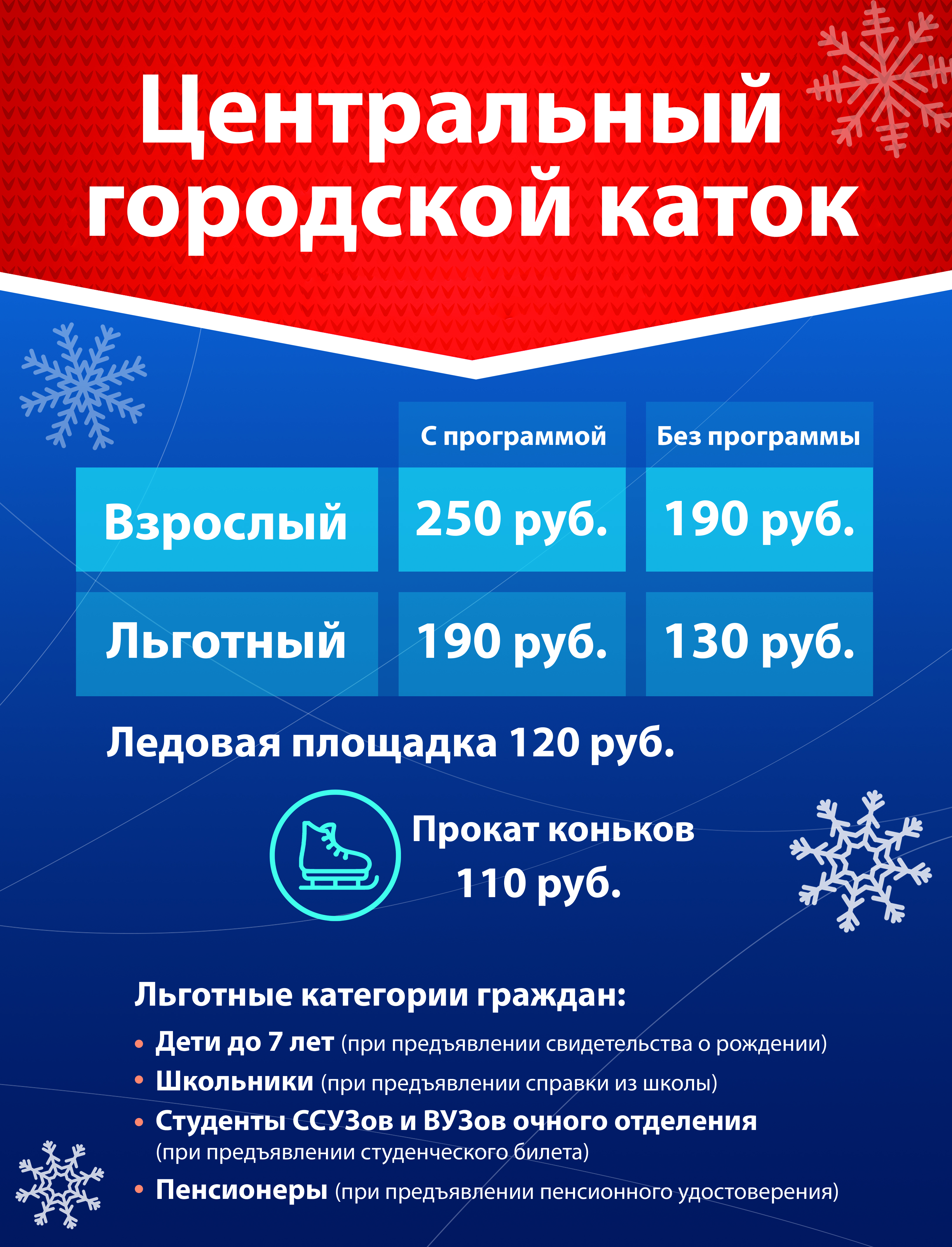 На вечерних массовых катаниях входить на территорию катка без коньков запрещается. Дети до 14 лет без сопровождения родителей или законных представителей на вечерние массовые катания не допускаются!