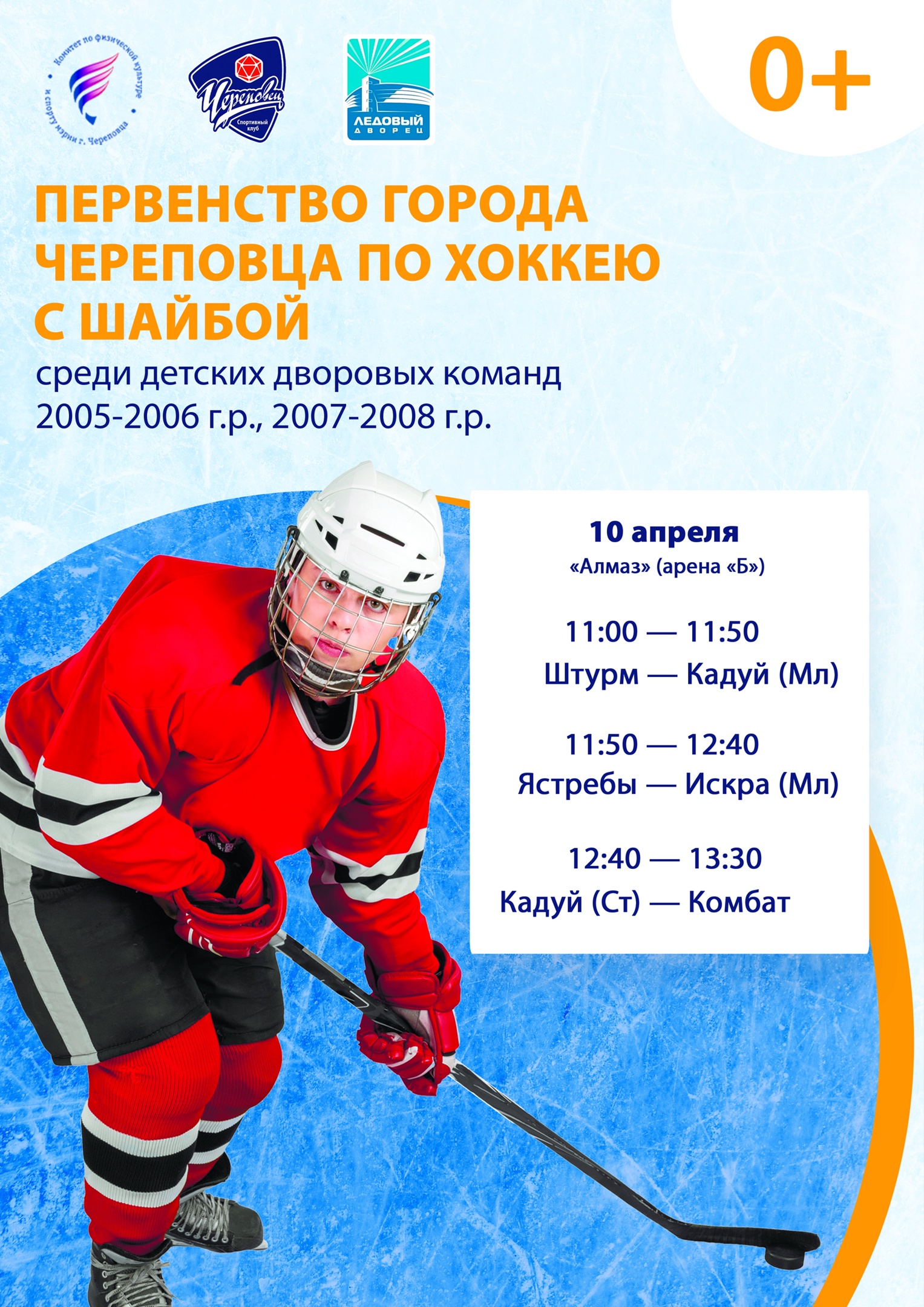 Соревнования будут проходить по выходным дням: 10, 16, 17 апреля в СКЗ "Алмаз" и МАУ "Ледовый дворец".