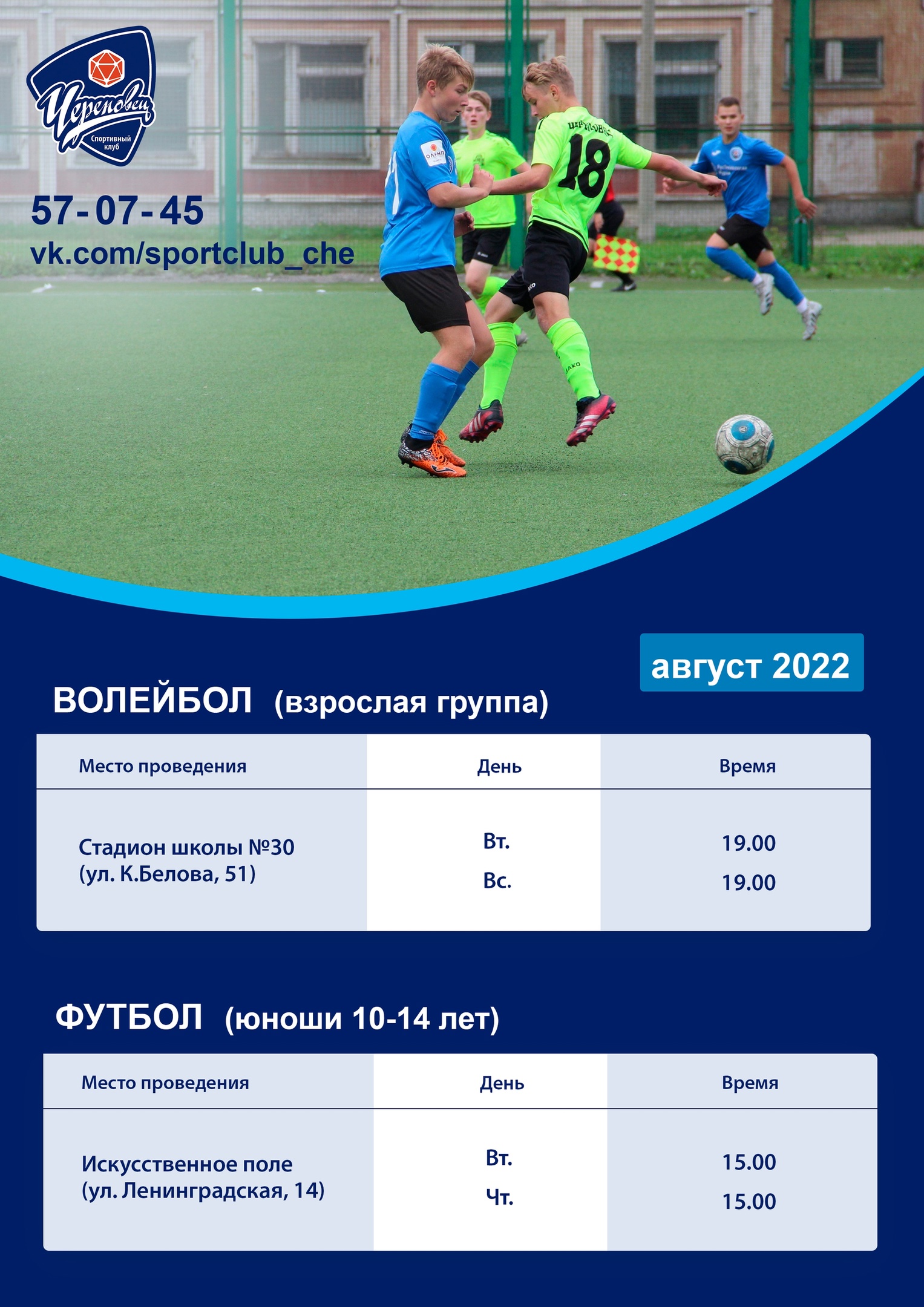- Футбол (детская группа). Место проведения: ул. Ленинградская, 14 (футбольное поле).