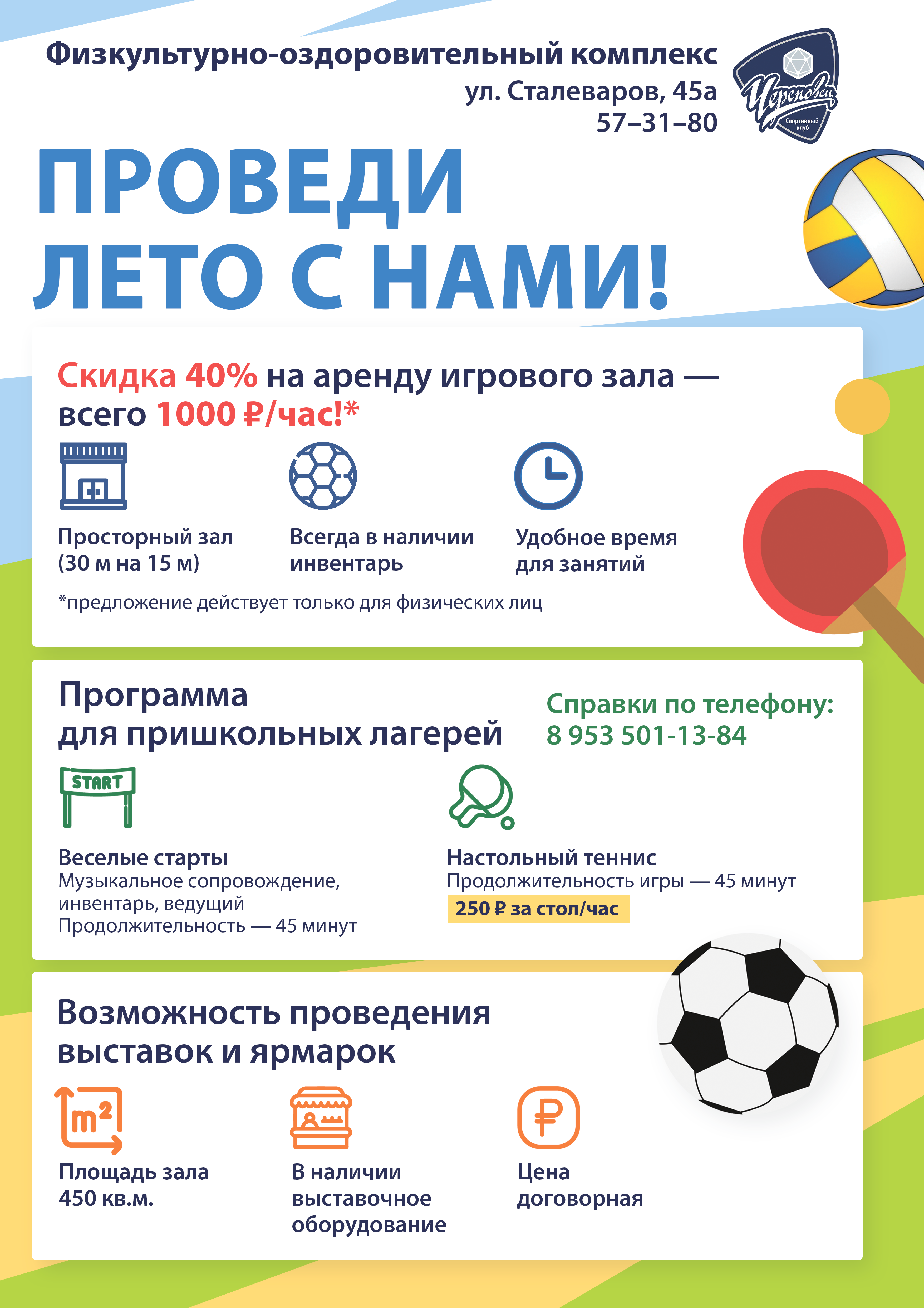 Собирайте компанию и приходите играть! Все лето (июнь-август) действует скидка 40%! Аренда зала 1000 руб/час!