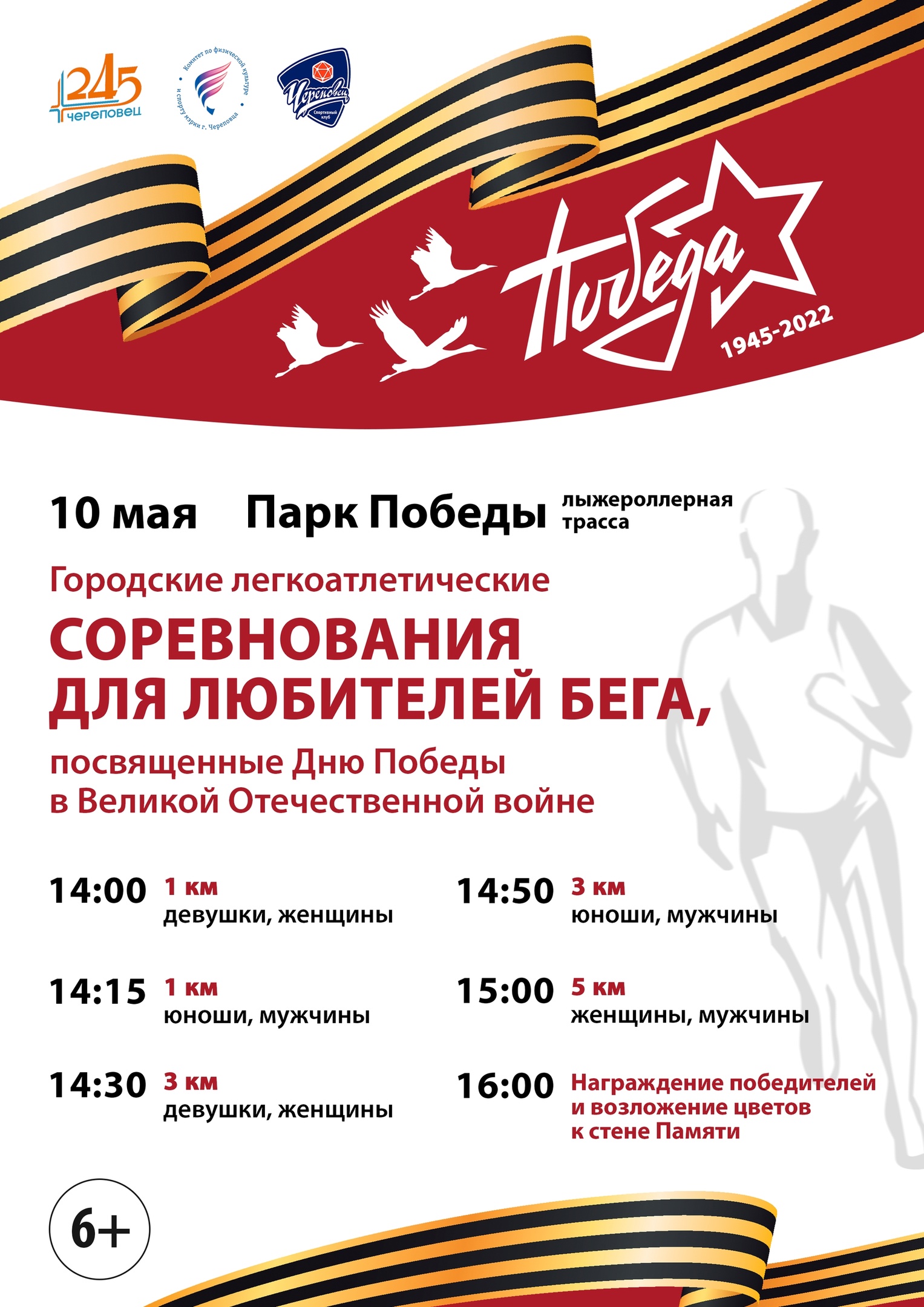 Городские соревнования среди любителей бега, посвященные Дню Победы, продолжают традиции легкоатлетического пробега «Череповец – Шалимово». В этом году возложение цветов к мемориалам в Череповецком районе пройдет на первом этапе. Соревновательный же этап состоится в парке Победы.