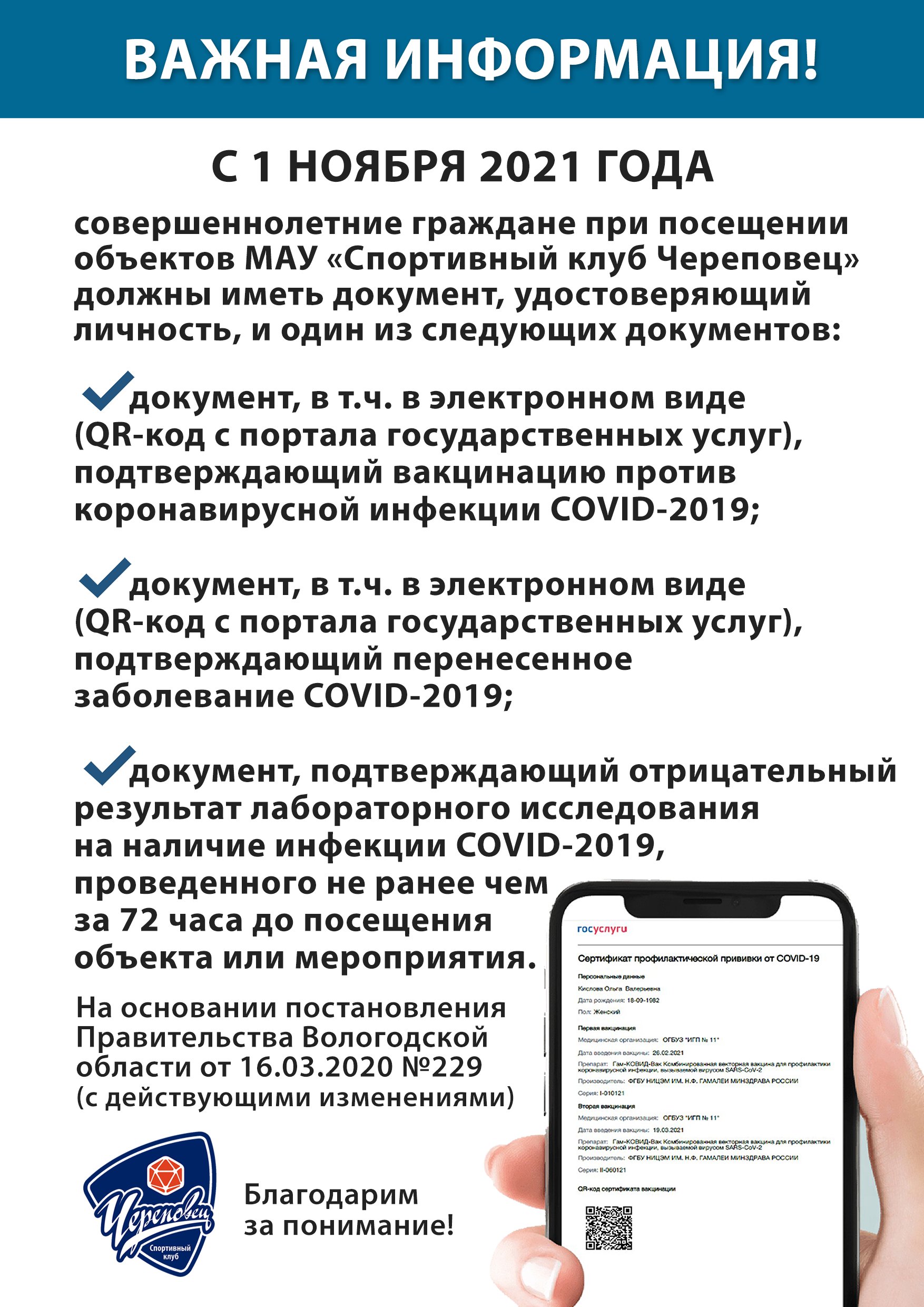 С 1 ноября 2021 года на основании постановления Правительства Вологодской области от 16.03.2020 №229 (с действующими изменениями) совершеннолетние граждане при посещении объектов «Спортивного клуба Череповец» (стадион «Металлург», Физкультурно-оздоровительный комплекс, Дом Физкультуры, Центр шахматно-шашечный, лыжная база) должны иметь документ, удостоверяющий личность, а также один из следующих документов: