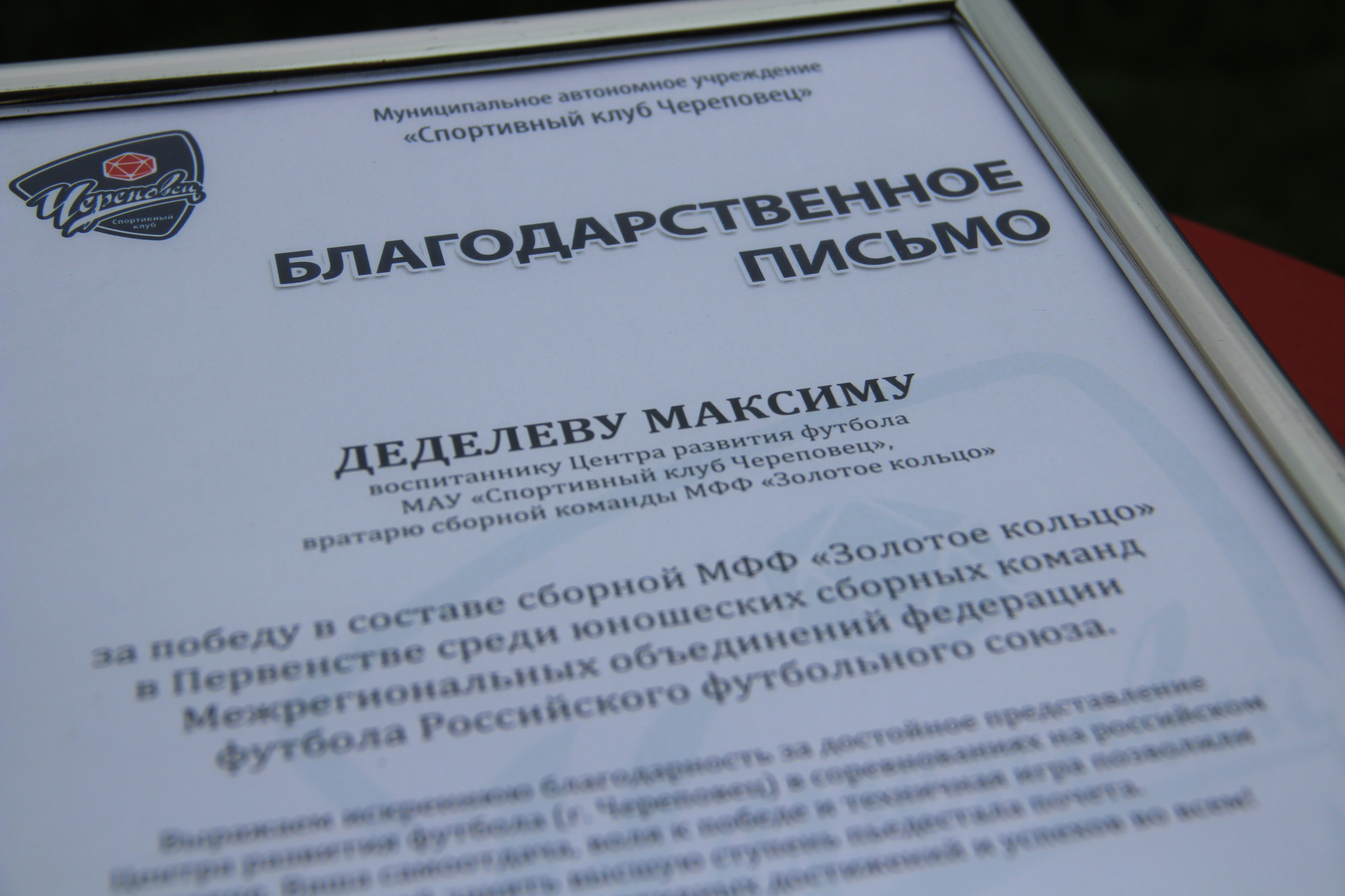 За достойное представление Центра развития футбола и нашего города на соревнованиях российского уровня игроки были награждены благодарственными письмами. В церемонии приняли участие председатель комитета по физической культуре и спорту Александр Мурогин и директор "Спортивного клуба Череповец" Сергей Назаров.